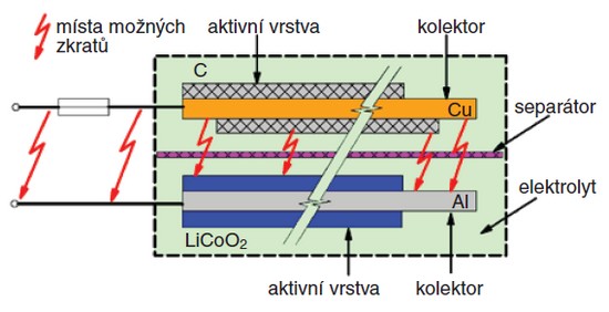 Obr. 1. Vnitřní struktura lithiové baterie s vyznačením míst možných zkratů