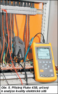 Jestliže je trend (směr poklesu nebo nárůstu) u proudu i napětí (obr. 2), shodná porucha pochází ze strany přívodu do rozváděče. Je tedy v nadřazeném rozvodu (napěťové poklesy vyvolávají proudové poklesy a naopak). Nyní je třeba hledat zdroj rušení v nadřazeném rozvodu, tzn. v rozvodu napájejícím jednotlivé patrové rozváděče. Jestliže je trend změny proudu a napětí opačný (obr. 3), nárůst proudu vyvolává pokles napětí a naopak a porucha se nachází na straně odběru – spotřebičů připojených na daný vývod. Dále opakujeme stejná měření na jednotlivých připojeních spotřebičů. Na tomto jednoduchém třístupňovém rozvodu je pak možné velmi rychle najít místo či odběr, které způsobují flicker. Bude-li se například na výstupu rozváděče na zásuvkovém obvodu vyskytovat nesouhlas trendu napětí a proudu, znamená to, že je rušení na některé zásuvce. Jestliže nyní provedeme měření na všech zásuvkách a zjistíme na některé (či spotřebiči) opačný trend proudu a napětí, znamená to, že rušení vzniká ve spotřebiči. Pokud zjistíme shodný trend, je zdrojem rušení nadřazené vedení mezi zásuvkou a rozváděčem. Může to být uvolněný spoj v zásuvce či rozváděči a podobně. Je-li křivka zobrazující průběh napětí či proud velmi „hrbolatá“, je ke zjištění trendu možné použít kurzor přístroje. Kurzor lze použít také pro zjištění impedance vedení. Vypočteme podíl mezi změnou U a I. Kromě rychlého a snadného zjišťování rušení a poruch na síti lze Fluke 43B použít i k dlouhodobým záznamům. Jestliže je přístroj připojen k PC a doba záznamu je neomezená, můžete například provést samostatný záznam dlouhý až 16 dní. Další možností dlouhodobých záznamů je použití Fluke VR101S – multifunkčního záznamníku událostí. VR101S poskytuje úplnou možnost zachycování poklesů a výpadků napětí ve tvaru síťového adaptéru. VR101S zaznamená až 4 000 událostí, jako jsou pokles napětí, výpadek, vzrůst napětí, přepětí nebo frekvence. Není monitorováno jen fázové napětí, ale i napětí mezi N a PE. Po nastavení prahových hodnot přístroj jednoduše zasunete do zásuvky. Po uplynutí požadované doby přenesete naměřené údaje do PC pomocí infračerveného rozhraní do dodávaného programu k jejich vyhodnocení (obr. 4). V tomto malém přístroji je nové to, že může zaznamenat směr šíření přechodného jevu. Systém je velmi ekonomický. Použijeme dvě jednotky VR101S. Jednu umístíme na stranu napájení (přívodní část rozvodu), druhou na stranu spotřebičů. Nastane-li přechodný jev, můžete v programu navzájem porovnat jeho průběh v obou místech. Přístroj Fluke 43B (obr. 5), jehož použití bylo výše popsáno na příkladu, je určen k analýze kvality elektrické sítě. Umožňuje měřit nejen proudy, napětí a výkony (vše jako skutečnou efektivní hodnotu), ale provádí i harmonickou analýzu všech uvedených veličin do 50. harmonické. Proud můžete měřit pomocí proudových kleští s převodem proud/napětí v podstatě s libovolným převodním poměrem, neboť je možné tento poměr volně v přístroji nastavit. Při měření výkonu měří samozřejmě výkon činný, jalový i zdánlivý a účiník. Při harmonické analýze napětí, proudu a výkonu můžete měřit fázový úhel každé harmonické a určit THD (celkové harmonické zkreslení). Kromě těchto vlastností přístroj také dovoluje dlouhodobý záznam napětí, proudu s možností kurzorového čtení s datovým a časovým záznamem, zachytávání napěťových či proudových špiček a deformace průběhu. Může zachytit až 40 napěťových přechodných jevů včetně uložení přesného času jejich výskytu do paměti. Vzhledem k možnosti měření výkonu je přístroj vybaven dvěma samostatnými vstupy. Vstup označený jako A je vstupem napěťovým do 1 000 V, do kterého můžete v případě potřeby připojit i teplotní převodník (například Fluke 80T150U/80TK) a zaznamenávat průběh teploty při měření kanálem B. Tento kanál je využíván pro připojení klešťového adaptéru při měření proudu a má nastavitelný dělicí poměr. Můžete kromě standardně dodávaných proudových kleští 500 A použít téměř jakékoliv kleště s vhodným převodem. Snadno tak změříte nejen velmi velké výkony, ale i velmi malé. My jsme použili při našich měřeních vzhledem k velmi malým proudům (řádově desítky miliampérů) proudové kleště japonské firmy KYORITSU, model KEW 8112, s rozsahem 20/200 mA/20 A pro zlepšení přesnosti měření. Fluke 43B umožňuje také komunikaci s počítačem pomocí opticky odděleného sériového rozhraní, takže se dají naměřené výsledky uložit do paměti přístroje a poté je, pomocí programu Conect and View®, přenést do počítače a zde je zobrazit, archivovat atd. Samotný Fluke 43B je vybaven velkým grafickým zobrazovačem LCD s velmi dobrým podsvětlením, známým z populárních Scopemetrů řady Fluke 123, ze kterých vlastně konstrukčně vychází. Proto jej můžete kromě výše popsaných funkcí použít i jako dvoukanálový vzorkovací osciloskop 20 MHz. Další podrobnosti o přístrojích F 43B a VR101S získáte u společnosti Blue Panther s. r. o. | |||||||||||||||||||||||||||||||||