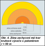 Zóna zachycení Paprsek je při dopadu na rotační zrcadlo vychylován tak, že vzniká zóna zachycení ve tvaru kruhové výseče s vrcholovým úhlem 190° (obr. 3). Zóna zachycení je pomyslně rozdělena na úhlové segmenty 0,36°. Doba přeběhu zóny zachycení, tj. doba, která uplyne mezi vysláním prvního a posledního paprsku, činí 40 ms, a četnost přeběhů tedy je 25 s–1. Jedním přeběhem se přitom rozumí vyslání paprsku postupně do všech úhlových segmentů. Standardně jsou nastaveny dva přeběhy na jedno vyhodnocení (změnu stavu výstupního obvodu). Poloha osoby nebo objektu se vyhodnocuje jednak podle aktivního úhlového segmentu, jednak na základě měření doby šíření vyslaného a odraženého světelného impulsu v daném úhlovém segmentu. Vzdálenost od skeneru je přímo úměrná době šíření světelného impulsu. Rozlišovací schopnost skeneru je 0,36°, což umožňuje spolehlivé vyhodnocení objektů o průměru 70 mm do vzdálenosti 4 m. Součinitel odrazu přitom musí být alespoň 1,8 %. Tato hodnota odpovídá odrazu od matně černého objektu a znamená, že skener je schopen spolehlivě vyhodnotit přítomnost osob také v tmavém oblečení.