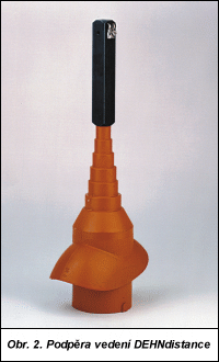 Dva přídržné body jímacího vedení znamenají lepší zajištění jeho polohy na střeše. Stejně jako podpěra FB je i varianta FB2 vhodná pro ploché neb o mírně šikmé střechy tam, kde je nežádoucí jakýkoliv zásah do střešní krytiny. Plastová i betonová část základní desky jsou odděleně recyklovatelné. Dodržení bezpečných vzdáleností od hromosvodu Jedním z úkolů hromosvodních systémů (vnější ochrany před bleskem), jejichž význam roste zvláště v souvislosti s ochranou citlivých elektronických zařízení v budově před atmosférickým přepětím, je zabránit průniku části bleskového proudu do kovových konstrukcí nebo elektrických instalací uvnitř budovy. Vniknutím části bleskového proudu přeskokem se totiž stává ochrana před přepětím často neúčinnou, a ochrany před přímým úderem blesku není dosaženo. Tento problém je v současné době zvýrazněn tím, že v podstřešním prostoru (i na povrchu střechy) často bývají položena elektrická vedení vnitřního rozvodu. Norma ČSN 34 1390 se tímto zabývá v čl. 112: Izolace kovových předmětů od hromosvodu, čl. 114 a čl. 122. Spolehlivé zvládnutí uvedené úlohy dodržením tzv. bezpečných vzdáleností částí vnější ochrany před bleskem a kovových nebo elektrických částí v prostoru střechy může být v praxi obtížné. Nový návrh řešení, který předkládají odborníci firmy Dehn + Söhne, spočívá ve zvětšení odstupu vedení nad úrovní střechy, čímž se zcela vyřeší pokládání vedení v prostoru pod střechou nebo na střeše. Použít tento postup umožňuje nová podpěra vedení DEHNdistance (obr. 2). Je-li použita, zjednodušuje se i řešení polohy dodatečně instalovaných vedení. |