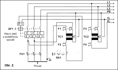 Obr. 4. Nepřípustný způsob zapojení bezpečnostního obvodu pro nouzové zastavení zvyšující pravděpodobnost vzniku závady v obvodu. Mnoho projektantů, naprosto nevhodně, používá zapojení z obr. 2 i pro nouzové zastavení rozsáhlých technologických celků a jmenovitý proud hlavního jističe dosahuje často hodnot několika stovek ampérů. Obvyklou slabinou řešení je absolutní zanedbání požadavků na zkratovou odolnost obvodů, které jsou připojeny před hlavním jističem. Pravidelně se opakující chybou konstruktérů je použití jen jednoho transformátoru (TC1) pro napájení všech řídicích obvodů. Při nouzovém zastavení ručním vypnutím hlavního jističe zůstávají řídicí obvody pod napětím, stykače pohonů neodpadnou a při zapnutí QF1 nastane neočekávané spuštění pohonů, které byly v chodu před nouzovým zastavením. Technicky i ekonomicky výhodnější řešení řídicích obvodů pro nouzové zastavení je na obr. 3. Jako zařízení pro nouzové zastavení slouží stykače jednotlivých pohonů, přičemž cívky stykačů jsou ovládány přímo přes kontakt vypínače s hřibovým ovládačem. K napájení všech řídicích obvodů (funkčních i bezpečnostních) v tomto případě stačí jeden transformátor. Pro úplnost je nutné uvést, že rukojeť hlavního vypínače musí být barvy šedé nebo černé. Za hlavním vypínačem QM1 je připojen transformátor pro napájení řídicích obvodů TC1. Přímo za jističem F2 je připojen vodič 2L, určený pro napájení řídicích obvodů těch zařízení, která nemusejí nebo nesmějí být vypnuta při nouzovém zastavení. Přes řídicí přístroj obvodu pro nouzové zastavení (SA1) je za jističem F2 připojen vodič 3L, určený pro napájení řídicích obvodů pohonů, které musejí být vypnuty při nouzovém zastavení. Stykače těchto pohonů musejí mít ovládání tlačítky a samopřídrž, aby po uvolnění ovládače řídicího přístroje SA1 nebyly neočekávaně spuštěny pohony. Vypínací schopnost kontaktu vypínače SA1 (pro induktivní zátěž bývá jen několik ampérů) výrazně omezuje maximální počet cívek stykačů, které mohou být v obvodu pro nouzové zastavení zapojeny. Tato skutečnost je hlavní překážkou, jež zabraňuje využít zapojení z obr. 3 v rozsáhlých řídicích systémech s mnoha stykači. Z neznalosti se mnoho konstruktérů uchyluje k velmi oblíbenému zapojení řídicích obvodů pro nouzové zastavení (obr. 4), ve kterém je použit stykač K1 jako proudový zesilovač pro kontakt vypínače SA1. Toto zapojení je z hlediska bezpečnosti nepřípustné, neboť mechanismus stykače K1 i jeho kontakty vnášejí do bezpečnostního obvodu (při porovnání s obvodem na obr. 3) další rizika, která zvyšují pravděpodobnost vzniku závady v obvodu. Zapojení nakreslená na obr. 2 a 3 znázorňují velmi jednoduché bezpečnostní obvody, jež se od sebe odlišují pouze použitým akčním členem a způsobem napájení. Nedostatky obou uvedených zapojení lze tedy posoudit souhrnně a přehledně je vyjádřit rozborem odolnosti obvodů proti závadám, tzv. analýzou závad, která musí být součástí každého návrhu bezpečnostního obvodu. Posouzení z hlediska obecně platných bezpečnostních zásad: - zemní spojení v bezpečnostním obvodu je detekováno (vypne jistič obvodu, při ztrátě napětí vypne akční člen),