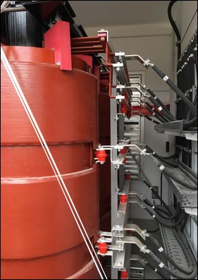 Obr. 5. Pohled do transformovny se suchým transformátorem z produkce ABB, určený pro rychlonabíjecí stanici. V pravé části obrázku jsou patrné vývody sekundárních vinutí.