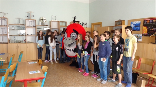 Na konci hodiny žáci dostali drobné dárky za asistence maskota Čepsulky