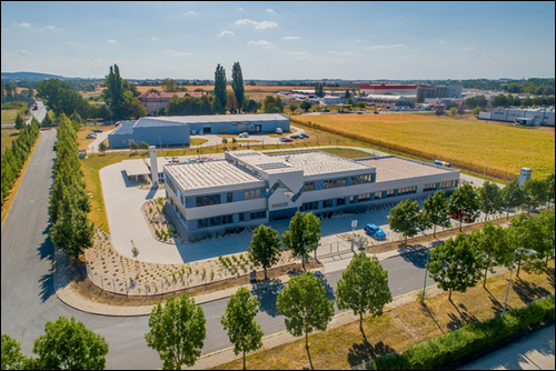 Obr. 1. Nová výrobně administrativní budova Teco, a. s., byla postavena v Kolíně na zelené louce. Provozně je také „zelená“. Nemá jedinou klimatizaci a v létě potřebovala na kompletní chlazení pouze 300 W na čerpadla pro oběh vody mezi chladicími stropy a 125 m hlubokými vrty na vlastním pozemku. V zimě na vytápění celé budovy stačí při –20 °C dokoupit 17 kW elektrické energie pro dvě tepelná čerpadla.