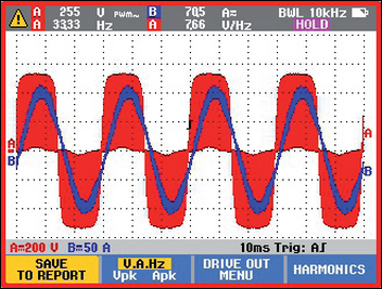 Na vstupu měniče může analyzátor motorového pohonu Fluke MDA 550 provádět harmonickou analýzu, podobně jako analyzátor kvality sítě. Motorové pohony mohou vytvářet harmonická zkreslení, která mohou potenciálně působit problémy na jiných elektrických zařízeních. MDA 550 je vybaven nástrojem, který dovoluje zjistit přetížení sítě harmonickými. Harmonické jsou sekundárním efektem výkonové elektroniky obecně, neboť výkonová elektronika má tendenci dodávat do sítě nesinusový proud. Analyzátor MDA 550 lze použít k posouzení dopadu tohoto jevu na síť, jak je patrné na obr. 5.