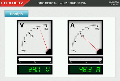 V průmyslu je stále nejžádanější komunikace pomocí bezpotenciálových kontaktů – reléových výstupů připojených na dispečink. Dále je zařízení kompatibilní se sběrnicovými komunikačními systémy typu Profibus či Modbus. Existuje též možnost dálkově upravovat provozní hodnoty jako např. nabíjecí proud, úroveň nabíjecího napětí či spouštět bateriový test. Alternativou místní i vzdálené komunikace je 7" dotykový displej se čtyřmi možnostmi zobrazení: blokovým schématem, aktuálními stavy a poruchami, hodnotami výstupního napětí a proudu a archivem poruch, který lze navíc automaticky ukládat na vyjímatelný flash disk ve formátu xls, takže lze s daty dále pracovat. Údaje zobrazené na LCD lze v té samé podobě zobrazovat i na vzdáleném PC (obr. 2).