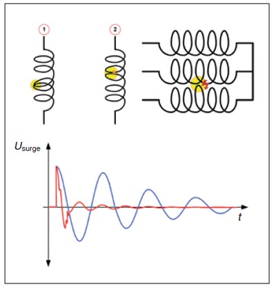 Pro ověření takovýchto situací lze snadno použít test rázovou vlnou. Při tomto testu je na jednotlivé cívky postupně přiloženo napětí z předtím nabitého kondenzátoru, jak je naznačeno na obr. 5. Na takto vzniklém rezonančním obvodu se objeví tlumené kmitání. Časový průběh tohoto kmitání charakterizuje stav vinutí. Změna periody a pokles amplitudy tohoto napětí na cívce jsou dány počtem závitů, indukčností cívky, stejnosměrným odporem i parazitními kapacitami vůči kostře motoru atd. V ideálním případě tedy např. při testu třífázového motoru budou tyto tlumené vlny mít stejný tvar pro všechny tři cívky. V praxi se budou v dobrém stavu vinutí lišit velmi málo (obr. 6). Při jakékoliv změně počtu závitů se tento stav projeví ve tvaru tohoto vlnění, a lze tak velmi