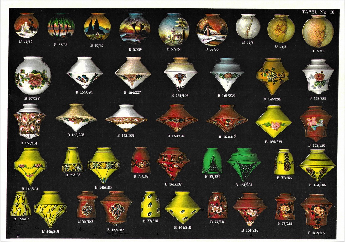 Na devátém listu katalogu jsou otevřená stínidla, tehdy zvaná zvonce, tulipány apod. Jde o osm tvarů v různém provedení. Osm stínidel v horní řadě je dekorováno hutně obalovanou barevnou drtí a nitkami. Dalších 42 má malované dekory – opět s pohledy do krajiny, více či méně stylizovanými květy, geometrickými dekory a mramorovanými plochami (obr. 14). Na desátém listu jsou uzavřená a otevřená stínidla především v tango barvách a s dekory zčásti inspirovanými stylem art deco, zase většinou v kombinacích geometrických motivů a stylizovaných květů, vedle toho jsou tři stínidla s mramorováním a šest stínidel s různými pohledy do krajiny (obr. 15).
