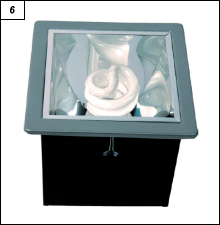 Obr. 1. Bodové svítidlo TECH 11 Základním prvkem konstrukce všech modelů svítidla TECH (obr. 2) je modul v podobě hlavice svítidla s reflektorem, jenž současně se žárovkou tvoří jediný „reflektorek„. Modul také dovoluje směrovat každé dílčí svítidlo ve dvou směrech, svislém i vodorovném. To umožňuje zaměřit svazek světla v podstatě libovolným směrem. Vybranou polohu hlavice je možné zablokovat aretačními šrouby, přičemž je lze ručně dotáhnout. Napájecí přívod, vedený od svítidla do podstavce, na kterém je hlavice umístěna, je chráněn ohebnou trubkou z korozivzdorné oceli. Jednotlivé prvky svítidel jsou vyrobeny z hliníku a oceli. Materiály jsou ponechány v jejich přirozené, „kovové” barvě a jejich povrch chrání průsvitný lak. Obr. 3. Bodové svítidlo TECH 24 Zmíněná svítidla mohou dobře fungovat jako bodové osvětlení objektů v místnostech, ale také jako hlavní osvětlení prostoru. Ve všech uvedených případech lze s nimi dosáhnout dekoračního osvětlení a rovněž tak i hlavního osvětlení (obr. 3). Další nová skupina – CROSO (obr. 5) – rozšiřuje nabídku zahradních svítidel vyrobených z korozivzdorné oceli. Tento materiál je i přes vysokou cenu vzhledem ke svým užitným i estetickým vlastnostem často vyhledáván architekty i projektanty osvětlení. Proto jsou také nástěnná zahradní svítidla s korpusy z korozivzdorné oceli často využívána jako svítidla pro všeobecného použití k osvětlování interiérů. Obr. 5. Venkovní svítidlo CROSO 110 Svítidla CROSO (obr. 5) jsou osazována halogenovou žárovkou s paticí GU-10 o maximálním příkonu 50 W, která je současně s objímkou umístěna uvnitř svislé tenkostěnné ocelové trubice, poblíž jejího horního konce. Tato trubice je korpusem svítidla. Je zakončena svinutým prstencem průhledného krytu z tvrzeného skla, jenž tvoří nepropustnou komoru chránící světelný zdroj. Po odšroubování prstence je možné snadno vyměnit žárovku. Nad horním koncem trubice se světelným zdrojem je připevněn reflektor, který je svým tvarem podobný kuželu. V jeho středu, pod vrcholem kuželu, je dodatečně instalován prvek odrážející světlo. Ten je rovněž kuželovitého tvaru, ale je směrován opačně než kužel hlavního reflektoru. Zmíněný prvek odrážející světlo je vyroben z leštěného ocelového plechu. Světelný tok žárovky je směrován nahoru na reflektor. Světlo odrážené od kuželového povrchu je v širokém úhlu rozptylu rozloženo do dvou rovin: vodorovné a svisle směrované dolů. Ve výsledku je prostor okolo svítidla osvětlení velmi rovnoměrně a světlo vytváří poutavý, v noci viditelný efekt. Vzhledem k velkému jasu výstupního otvoru je nutné svítidlo instalovat tak, aby byl kužel reflektoru níž než oči pozorovatele. CROSO 25 (obr. 4) je nástěnné svítidlo, které je vhodné k osvětlení vstupů, vjezdů a také ke zvýraznění vybraných míst v zahradě. Dále ho lze využít k dekoračnímu osvětlení budov. K osvětlení alejí a teras se využívá jeho stojanová verze, CROSO 45, nebo verze s větší výškou, CROSO 110 (obr. 5). Na úrovni paty svítidla je osvětlení velké intenzity, je však rovnoměrně rozloženo; to je jednou z výhod nepřímého osvětlení odraženým světlem. Svítidla jsou se stupněm krytí IP44 a patří do I. třídy ochrany proti úrazu elektrickým proudem. Obr. 3. Bodové svítidlo TECH 24 Nová řada svítidel TEO je pokračováním nabídky svítidel typu „downlight„ určených pro běžné žárovky s objímkou E27 o maximálním příkonu 60 W. Ve svítidlech, jejichž označení končí písmenem L, je možné používat nejen běžnou žárovkou, ale také kompaktní zářivky SEB z nabídky Brilux (obr. 6). V modelech s názvem končícím písmenem S mohou být používány kompaktní zářivky SEB MINI. Zmíněná svítidla jsou vybavena prvky I. třídy ochrany proti nebezpečnému dotykovému napětí a jejich stupeň krytí je IP20. Těleso svítidla je zhotoveno z ocelového plechu a funguje jako nosný prvek reflektoru i světelného zdroje. Reflektor hranatého tvaru s centrálně umístěnou keramickou objímkou E27 je vyroben z hliníku. Svítidlo se celé zabudovává do stropu. Konstrukce se opírá o vnější límec, jedinou viditelnou část, jež vystupuje ze stropu. Verze řady TEO, které jsou určeny pro jeden světelný zdroj, nesou označení TEO 10L a TEO 10S. Modely se liší velikostí, TEO 10S má reflektor o šířce 115 mm, zatímco u TEO 10L je to 145 mm. I ostatní rozměry svítidla TEO 10L jsou větší. V modelech pro dva a tři světelné zdroje jsou všechny zdroje umístěny za sebou (svítidla mají tvar obdélníku). Verze se čtyřmi světelnými zdroji (obr. 8, 9) je nabízena ve dvou tvarech: obdélníkovém, kde jsou zdroje umístěny v jedné přímce (TEO 40S a TEO 40L), a čtvercovém (TEO 44S a TEO 44L). Svítidla obdélníkového tvaru mohou být instalována za sebou a tvořit tak světelné pásy. Zmíněné řešení je vhodné do dlouhých chodeb nebo úzkých místností.
