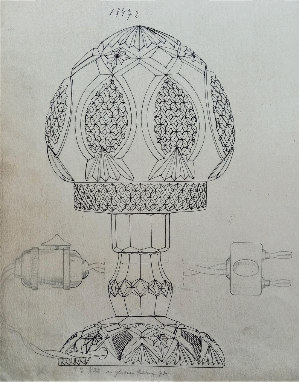 Obr. 8. Návrh svítidla s bohatým broušeným dekorem převážně z klínových řezů, 30. léta 20. století (Státní okresní archiv Most)