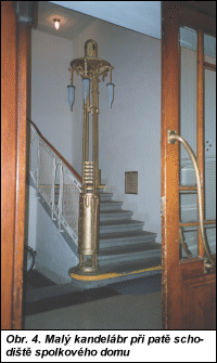 Svítidla použitá v budově muzea jsou již naprosto funkční, ještě méně dekorativní, konstrukce elegantního podélného tvaru závěsného lustru z čítárny je již vytvořena z pouhého mosazného hranolu. Baťa si Kotěru vyvolil k přestavbě své rodinné vily ve Zlíně roku 1912. Poté byl Kotěra autorem prvních návrhů rodinných domků pro dělníky Baťovy továrny. Jako organizátor založil v roce 1913 Svaz českého díla, aby se česká umělecko-užitková tvorba mohla zúčastnit přehlídky na výstavě Werkbundu v Kolíně n. R. Kotěra jako učitel vychovával své žáky (P. Janák, J, Gočár, J. Zázvorka, J. Kalous, B. Fuchs, J. Fuchs, J. Krejcar, F. Gahura, E. Králík, A. Metelák ad.) k samostatnému myšlení a osobitému výrazu a stal se tak iniciátorem české moderní architektury. Byl příkladem architekta-umělce, jehož empatie k prostoru a k aktuálním potřebám společnosti ústila do hlubokého vyjádření současného životního slohu, jak dokládá jeho široce zaměřená tvorba. Mohli bychom pokračovat v dlouhém výčtu z Kotěrovy tvorby, upozorněme jen na to, že je také autorem budovy Právnické fakulty UK v Praze, jejíž kompletní realizace se již nedožil. Zemřel v Praze roku 1923. F. X. Šalda zhodnotil Kotěru na jeho posmrtné výstavě roku 1926 takto: „Kotěrova tvorba ukazuje, co je nutnost a síla, co vázanost a přece svoboda, co duch, který nalezl míru a zákon v sobě.“ Shrnutí celoživotní Kotěrovy tvorby představí výstava, kterou nyní připravuje tým kurátorů pod vedením prof. Vladimíra Šlapety pro Obecní dům v Praze a která bude otevřena v polovině prosince 2001. Na této výstavě bude představen také původní kandelábr s bronzovou figurínou ženy z divadelního balkonu, zrekonstruovaný z nalezených a za války ukrytých mosazných dílů. Byl znovu vzkříšen zásluhou nebývalého pochopení ředitelky prostějovského divadla PhDr. Jany Zikmundové a sponzora České spořitelny. |