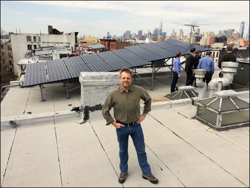 Lawrence Orsini, zakladatel a CEO startupu LO3 Energy, na střeše domu v Brooklynu, který je napojený na mikrosíť
