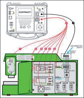 Měřením se ověřuje, že neživé vodivé části rozváděče jsou připojeny ke svorce pro přívod vnějšího PE vodiče, a tím bude zajištěno jejich spolehlivé uzemnění. K měření se použije ohmmetr generující měřicí proud AC nebo DC o velikosti minimálně 10 A.