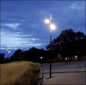 Podél obvodových komunikací jsou umístěny kónické ocelové osvětlovací stožáry o výšce 5 m se svítidly CitySoul Gen 2 Mini s vhodnou optikou (obr. 3). Na ploše náměstí jsou světelná místa stejného vzhledu jako podél obvodových komunikací, avšak svítidla mají odlišný světelný tok a odlišné rozložení svítivosti. Dále jsou zde dva kónické ocelové osvětlovací stožáry výšky 6,5 m se třemi LED svítidly CitySoul Gen 2 Mini osazenými na speciálních držácích Accent ve výšce 5 m, 5,5 m a 6 m se vzájemným pootočením vzhledem k ose stožáru o 120°, na vrcholech stožárů jsou osazeny prosvětlené špice LED top point, luminous cup (obr. 4). Tato stylová světelná místa jsou situována u nízké obloukové zídky s vytesaným názvem náměstí, lemované LED pásky (obr. 5 a obr. 6). Osvětlení LED pásky je rozčleněno do jedenácti segmentů délky 2 m. LED pásky jsou osazeny do hliníkových lišt opatřených na koncích koncovkami, v lištách jsou LED pásky zality průhledným silikonem a zakryty krytem z polymetylmetakrylátu (tzv. plexiskla) nasunutým do lišt z boku. Lišty jsou k zídce upevněny speciálními úchyty a atypickými šrouby. Dvě zemní svítidla D-CO R LED MAXI byla umístěna tak, aby prosvětlila koruny košatých stromů (obr. 7).