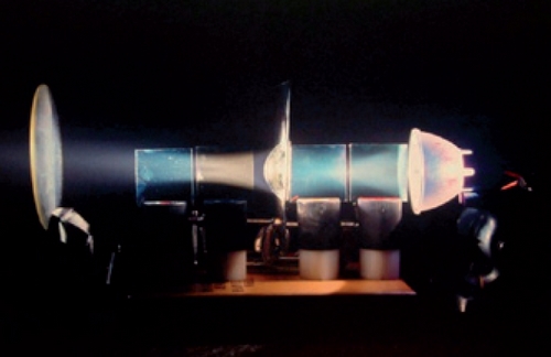 Obr. 8. Jeden z prvních modelů optické soustavy automatizovaného světla v dílně Vari-Lite [Zdroj: FIGURE 15. 3. MOODY, J. L. – DEXTER, P.: Concert lighting: techniques, art, and business. 3rd ed. Boston, Elsevier/Focal Press, c2010, s. 160. ISBN 978-024-0806-891.]