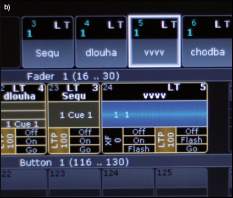 Obr. 3. Obrázky VVVV a Grand MA OnPC: a) grafické programovací prostředí VVVV, b) jeho napojení na virtuální pult Grand MA OnPC pomocí Art-Netu pouze přidáním jediného příkazu v programu VVVV (tomu předchází správnénastavení IP adres).