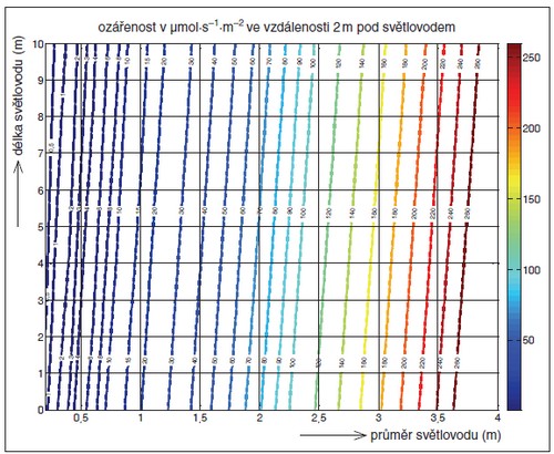 Z obr. 3 je zřejmé, že příspěvek od světlovodu běžně dostupných průměrů, tj. přibližně do 50 cm, je oproti požadované hodnotě 150 až 300 μmol·s–1·m–2 na hranici 1 %. Z toho vyplývá, že k zajištění dostatečné hladiny osvětlení, resp. ozářenosti, je nutné použít světlovody velkých průměrů. To je v reálu vzhledem k nízkému příspěvku a vysoké ceně světlovodů neekonomické, a při pominutí finanční stránky věci i v některých případech dokonce nemožné, neboť plánované rozměry fytotoronového boxu budou přibližně 3 × 5 m, a tak by na stropě už nezbylo místo pro další technologická zařízení (osvětlovací soustava, větrání, topení atd.).